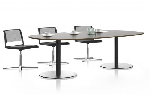 Der Zentralfuß mit runder Bodenplatte ist die Basis von LET'S TALK ROUND. Die ovalen Tischformen bei VARIO LET'S TALK ROUND sind das Resultat umfangreicher Testanordnungen zu verschiedenen Besprechungssituationen. Die Stirnseiten sind stark verrundet, um dem hier Sitzenden ausreichend Fläche zu bieten, die Längsseiten sind leicht gespannt um allen Teilnehmern Blickkontakt zu gewährleisten. Jede Kombination mit einer der vielen Tischplattenfomen in unterschiedlichen Materialausführungen und Höhenvarianten ergibt einen modernen, visuell zurückhaltenden und kommunikativen Besprechungstisch.