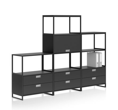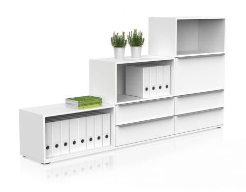 Als Ergänzung zum M1 Stapelboxsystem hat VARIO ein filigranes Rahmenelement entwickelt, das nun eine extrem große Variantenbildung zulässt. Ob Sitzgelegenheit, Raumteiler, Sideboard oder hohe Regalwand, ob Schreibtisch- und Stehtischkonfigurationen, für Einzelarbeitsplätze oder für Gruppenbüros – das alles ist ohne Werkzeug und unkompliziert aufzubauen. Das M1 Rahmenelement gibt es in zwei Breiten und in drei Höhen, das Bodenelement ist 100 mm hoch und mit Stellgleitern ausgestattet. Die Farbe ist entweder schwarz oder weiß. Für die Einlegeböden und Abdeckplatten stehen die gleichen Oberflächen wie für das M1 Stapelboxsystem zur Verfügung, zusätzlich können sie in schwarz oder weiß bekantet werden, je nachdem welche Rahmenlementfarbe gewählt wird.
